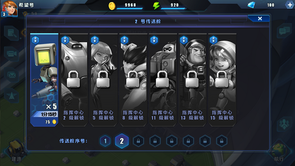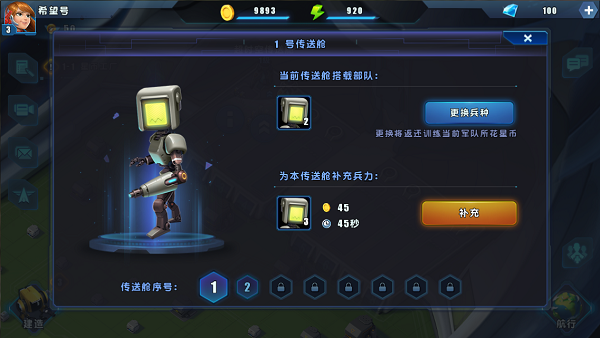 当传送舱中已经存在一定数量的战斗部队时,我们也可以选择补充或更换传送舱中的部队,只需选中传送舱,点击训练按钮,进入对应传送舱的详情界面。