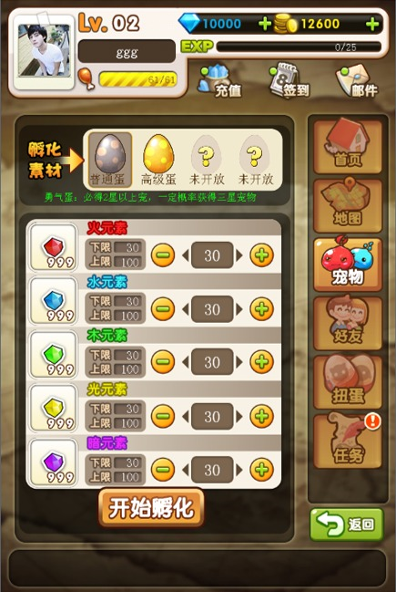 选择孵化不同品质的蛋,需要用到的属性矿石品质也不一样哦,孵化高品质的蛋,可以大幅提升高星级和稀有宠物的出现概率哦!快来试试吧。