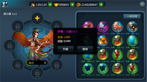 n 点击某个妖兽,在弹出的菜单中选择升级按钮,进入升级界面。