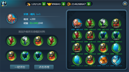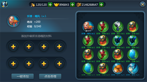 n 添加完材料后,点击“点击吞噬”按钮,便可吞噬掉材料,给主妖兽增加经验。
