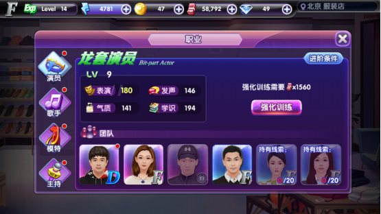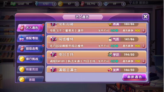 首先活动的等级分别为F-、F、F+、E-、E、E+等等,级别越高完成活动后获得的奖励也越多。在同等级的活动内又分为发声、气质、学识、表演这四类。比如上图F类电台主持任务中我们可以看到学识194/50这里194是自己目前的能力值,50则事学识大于等于50后才能做这个任务。