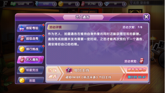 最后 我们会在艺人通告活动中看到今天还可以完成的剩余次数和任务在多长时间后可以进行。