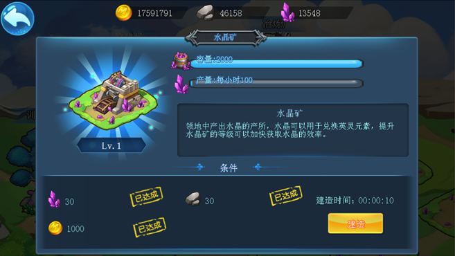 建造水晶矿可以获得大量的水晶矿资源,水晶矿的等级越高超出的水晶资源越多