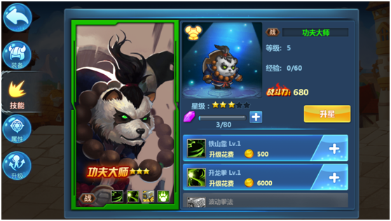 【技能】界面可以看到详细的英雄技能说明,给英雄升级技能也是在这个页面完成的。