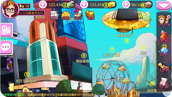 ⑫ 侧边栏——小伙伴(英雄)、手袋(背包)、人品(就是人品咯)、任务(主线、支线任务)、日常(日常活动)