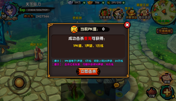 1.玩家在城镇中,点击城镇中的玩家可以选择击杀,每日相同玩家限制击杀3次 。