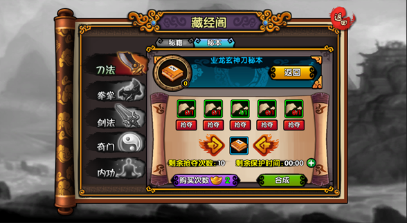 2. 【秘本】:可以查看所有秘籍所需升级的秘本,在此可以抢夺其他玩家的秘本碎片后,进行合成整本秘本。不想被其他玩家抢夺,可购买保护时间。
