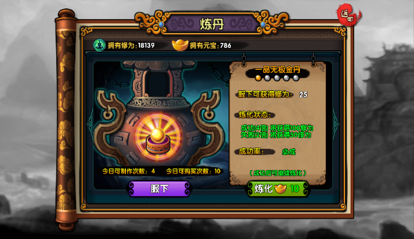 炼丹说明:制作修为丹后,可立刻使用获取修为。或者进行炼化,使修为获得更多的收益。