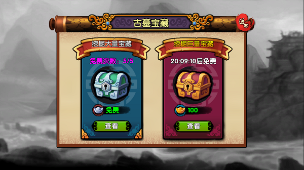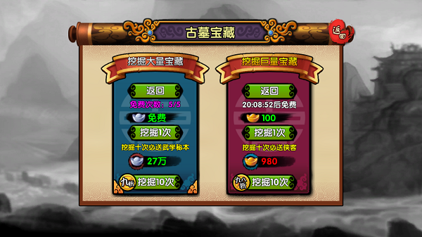 古墓宝藏是获取各种奇珍道具、稀有侠客的场所。宝藏有两种挖掘方式:‘消耗银两’或者‘消耗元宝’进行挖掘,每种方式都可以随机获得宝贝,选择挖掘10次,是必送稀有宝贝的!