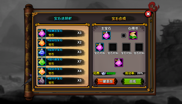 合成说明:选择一颗想要升级的宝石,放置相同等级的宝石作为合成材料,每一颗宝石材料可增加20%成功率,最少放入一颗宝石。心得书可额外增加20%成功率。合成成功,宝石升级为下一级宝石。合成失败,宝石材料消失。