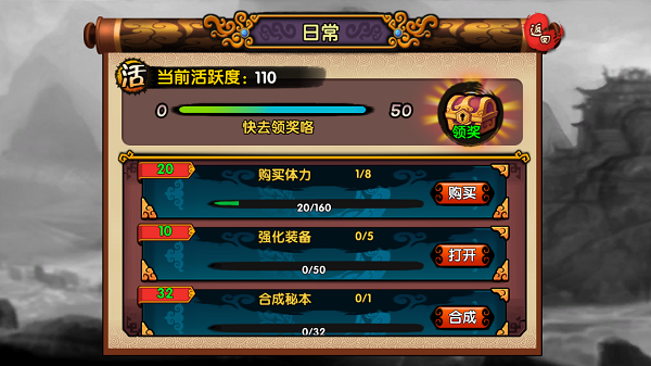 日常是获取活跃度领取奖励的场所。玩家可以每天通过完成日常,获取活跃度激活日常宝箱领取奖励;活跃度还可以增加玩家所在帮派的经验值!