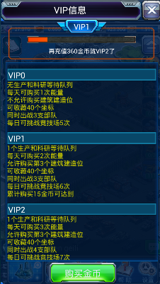 玩家可以在这里使用RMB购买游戏中很重要的金币,并获得一定的优惠!玩家充值到一定数额可以获得相对应的VIP特权,让你在游戏中快人一步!可以说充值功能的爆发性很强,可以让你一下子从屌丝变成高富帅。但充值又不是盲目的,充的多是会很爽,但是体验游戏真正的乐趣更为关键!