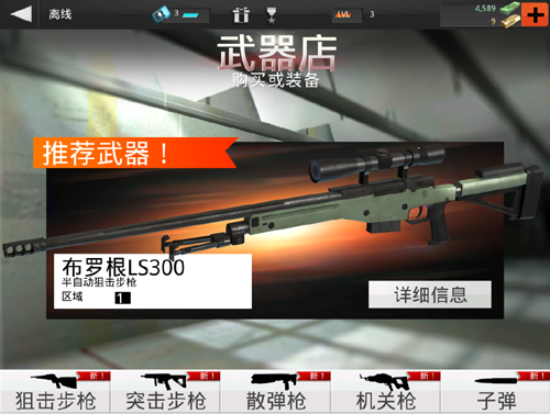 游戏中的所有枪械,枪械的升级、更换操作都是在武器库中。每个任务场景都允许玩家携带主、副两把枪支,同一类枪支只可以携带一把,购买和使用的方法如下。