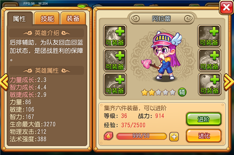 点击英雄以后进入英雄详情界面,这里显示了英雄的属性和介绍,并且可以武装自己的英雄,为他们穿戴装备,提升星级,提升品阶和升级技能。