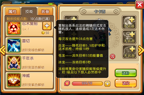 切换到技能界面点击加号即可提升技能等级,长按技能框可以显示这个技能的详细说明。