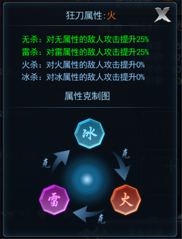 (1)除了功能对抗以外,游戏中的所有角色与怪物都有自己的属性(冰/火/雷),属性之间循环相克,被克制一方将受到额外的加成伤害;