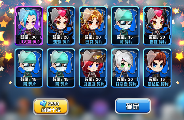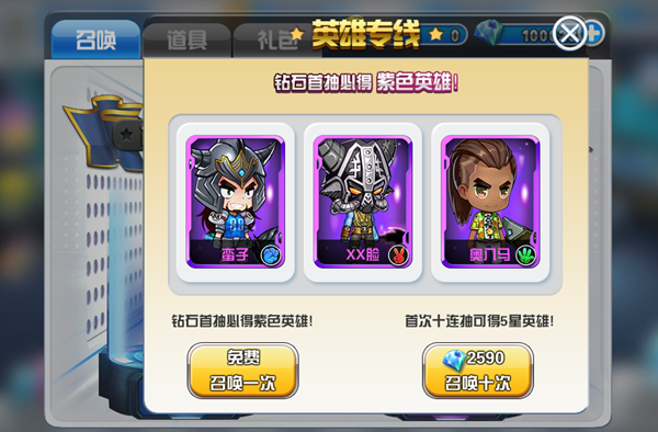 在英雄专线中玩家会会招募到各种各样的英雄呢,而且除了一次召唤外,还能十次连召,想想还有点小激动呢。值得一提的是,如果获得了整个角色,而小伙伴主角中已经收集到了这个人物,系统会自动将这个角色转化成碎片放进小伙伴的背包里哦。