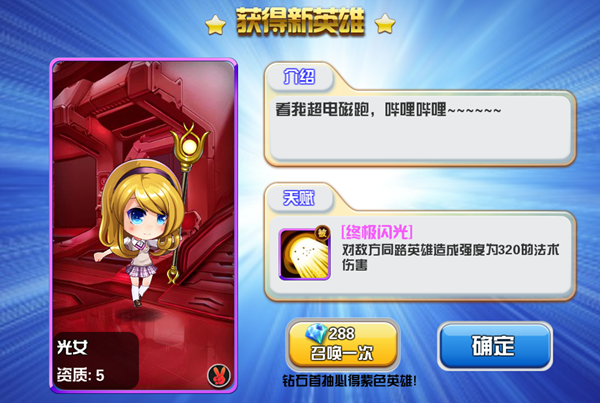 在各位小伙伴们第一次来到这个世界的时候,英雄们还是很友好的,第一次使用英雄热线一定会召唤到英雄呢。看看小编华丽的光女吧。
