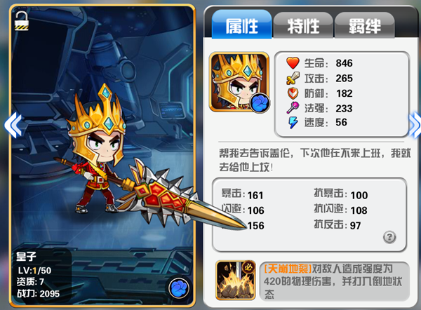 说完草丛伦,我们来说一下战士中的另一个代表人物——皇子,这位带着华丽皇冠的英雄拥有令人羡慕的橙色品质。优秀的暴击属性使得皇子能够爆发出成吨的伤害。从其自带的天赋技能上看,皇子可以再装备一个必杀技和一个追击类的辅助技,这样的话,一但触发技能就会在瞬间爆发出恐怖的伤害。所以说一但获得了皇子,那就圆满了。