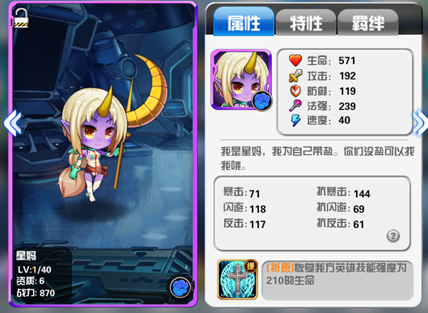 作为少数的拥有辅助属性的英雄,星妈绝对是最首屈一指,作为一名紫色的英雄,星妈的培养价值非常高,而且初始自带一个加血技能,不俗的法强属性让星妈在主阵容中牢牢占据了一席之地。作为一个优秀的辅助除了单纯的加血意外,星妈的特性也十分契合她的身份,法强叠加,增加闪避,几率沉默,这些特性让星妈牢牢占据了辅助一姐的地位不容撼动。