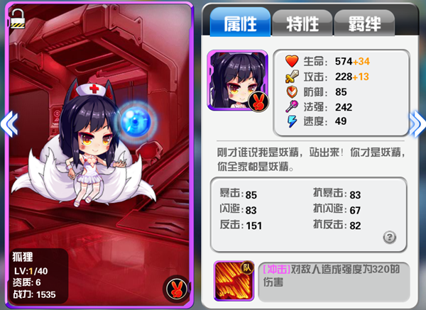 狐狸在撸啊撸2 是一个比较有趣的英雄,优秀的法强资质和反击属性,使得狐狸成为了一位特殊的法师。天赋技能属于队长及,如果玩家在初期召唤的时候就成功的招到了狐狸的话,那么不要吝啬,赶快培养吧。成熟的狐狸绝对超乎你的想象。