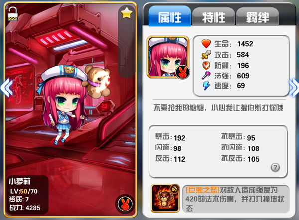 下面小编来介绍下个人最喜爱的英雄,那就是下面这位小萝莉,这个萌萌哒小萝莉拥有着高达315的初始法强,足以蔑视其他全部英雄,配合上巨熊之怒的天赋技能,这个小萝莉在入手之后绝对值得马上培养,而且在培养方向上这个小萝莉即使无脑堆法强也能一方强者。