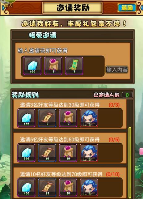填写别人的邀请码即可获得100钻石、紫卡碎片包、刷新令等道具