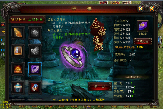 玩家激活法宝后,可以使用法宝进阶石来升级心法等级,提升心法等级可以加成角色物攻、魔攻、道攻、物防、魔防属性,从而提升一定的战斗力。法宝进阶石可以通过击杀世界BOSS和60级怪物获得。