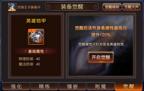装备觉醒等级需达到40级开放此功能;紫色品质以上装备可以做觉醒。