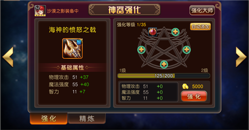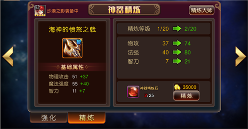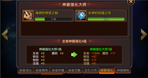 神器消耗材料可以进行强化和精炼来获取更多的属性;同时强化、精炼可获得属性增益,并且拥有神器强化套装,精炼套装效果;可以大幅度增加小队战力哦!