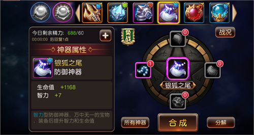 等级达到19级即可开放此功能,分别为三种品质:蓝色、紫色、橙色。其中蓝色和紫色的神器可以用来升级使用。