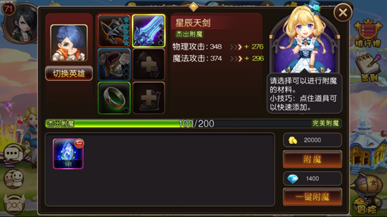 附魔是额外增加一定百分比的基础属性值,当游戏角色达到28级时开启。装备共分5个附魔星级,玩家通过收集魔能之源等附魔材料,为玩家的装备进行升级。