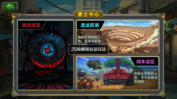 《战车世纪》的勇士中心,分为挑战诺亚,遗迹探测和战车远征3块挑战区。其中遗迹探测需到达20级解锁,战车远征需到达25级解锁,挑战诺亚需到达30级解锁。