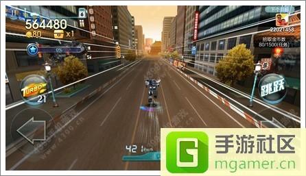 机甲的技能跟普通赛车不同,超车一定数量,可触发变形技能,就是下图所示的机器人,在机器人形态下锁油并且combo不断,这个技能恐怕就是机甲车最大的亮点了,类似于梦幻冲状态下可combo,而且技能持续时间较梦幻冲状态要长。