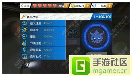 突破改变属性:加速度15.6Km/s(+0.6)、最高速度465Km/h(+7)、节油性能36.1Km(+0.4)、重量10000KG(+10000)、能量获取+26.0%(+6%)、变形时间26.0S(+3)