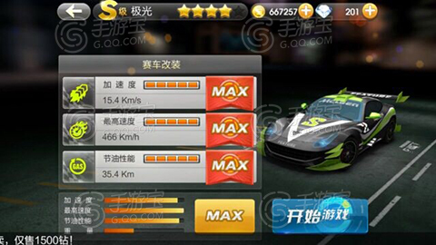 我们先来看看极光的属性,满级极光:加速度15.4、最高速度466、节油性能35.4、积分加成14%,先不谈S车的隐藏属性,单看表面数据加上极光的两项技能,小编就已经肯定尼玛这车已经是超越朱雀、雷瑟、科迈罗和红色先锋的节奏了。