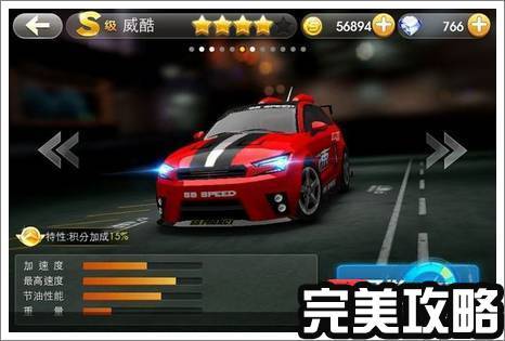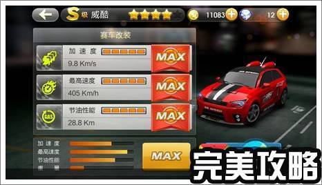 赛车属性:加速度9.8Km/s、最高速度405Km/h、节油性能28.8Km
