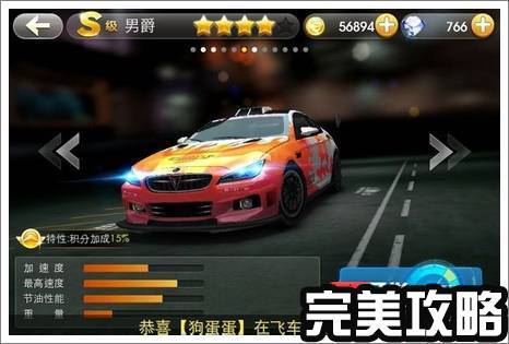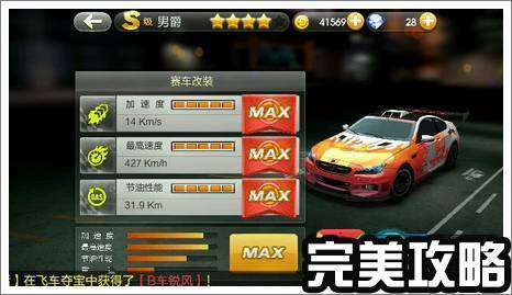 赛车属性:最高加速度14Km/s;最高速度427Km/h;节油性能31.9Km