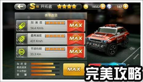 感谢玩家投稿:开拓者S级升级需要1200钻石。最高加速度14.4Km/s;最高速度431Km/h;节油性能33.3Km