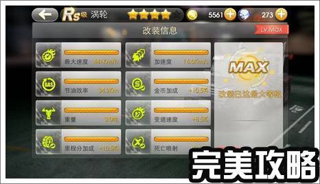 最大速度441Km/h、加速度16.0Km/s、节油性能34.2Km、金币加成+10.5%
