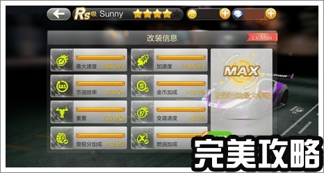 赛车属性:最大速度455Km/h、加速度14.8Km/s、节油效率34.3KM、金币加成+10.5%、重量700.00kg、变道速度+8.5%、里程分加成+10.5%、燃油加成+22%