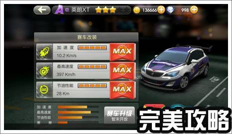 赛车属性:加速度10.2Km/s、最高速度397Km/h、节油性能28Km