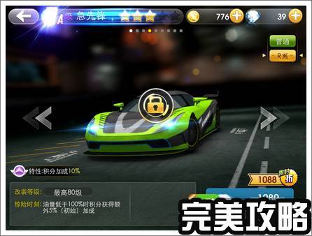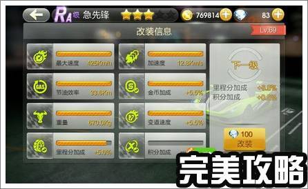 赛车属性:最大速度425KM/h、加速度12.8Km/s、节油效率33.6Km。(后续稍后补充)