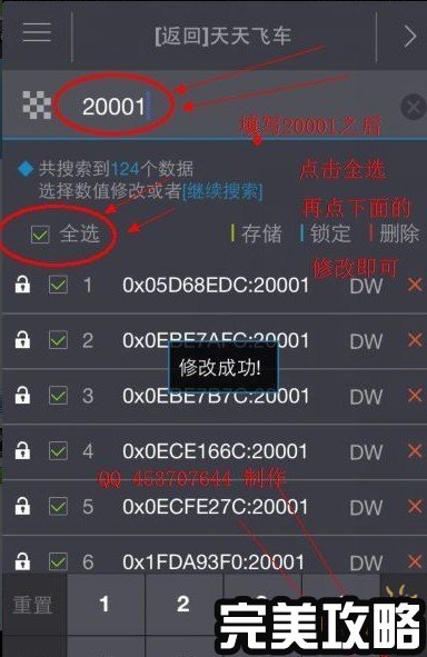 5、填写20001,再点下面的那个全选,然后再点右下角的修改,即可完成无限隐身