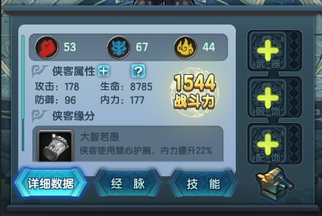 在侠客详细资料面板右侧的每个装备孔右侧,均有一派小孔,这排小孔就是装备宝石孔。