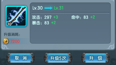 玩家使用金币可对装备进行升级。装备等级越高,属性越强。装备的等级受少侠等级的限制。每件装备的成长属性均不同。