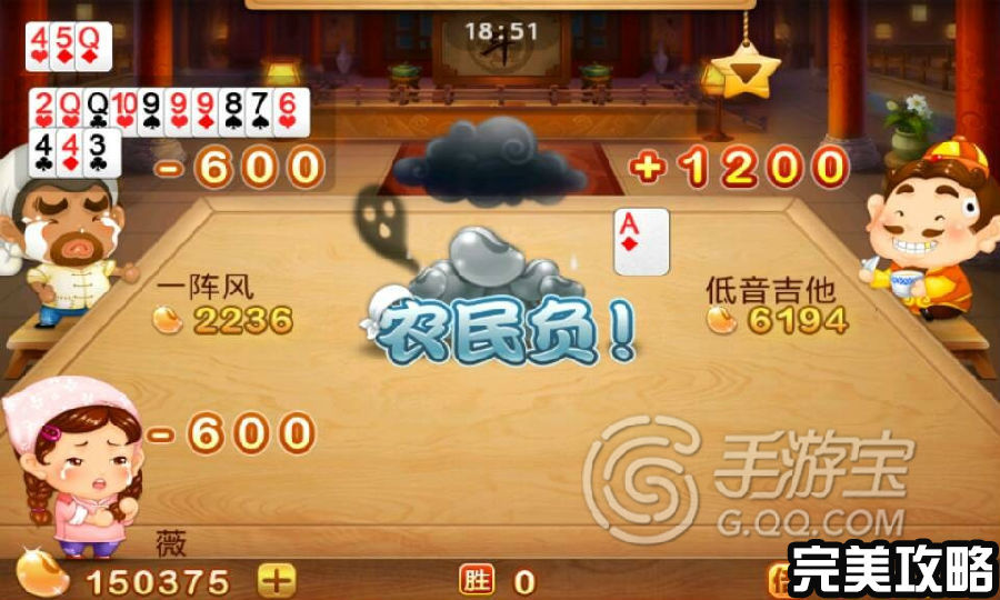 若你有一对王和四个Q,农民可能有四个9,当你有能力打完时,你可以先王炸,然后打到后面故意做出要一口气打完的样子,如果农民炸了你,就笑着再给他补四个Q吧。