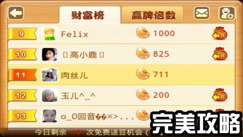 游戏右上角的“财富排行榜”中是你和你的小伙伴们的财富榜排名,通过点击小金袋可以给对方欢乐豆,当然对方也可以给你啦~不过每天只有10次机会哦。
